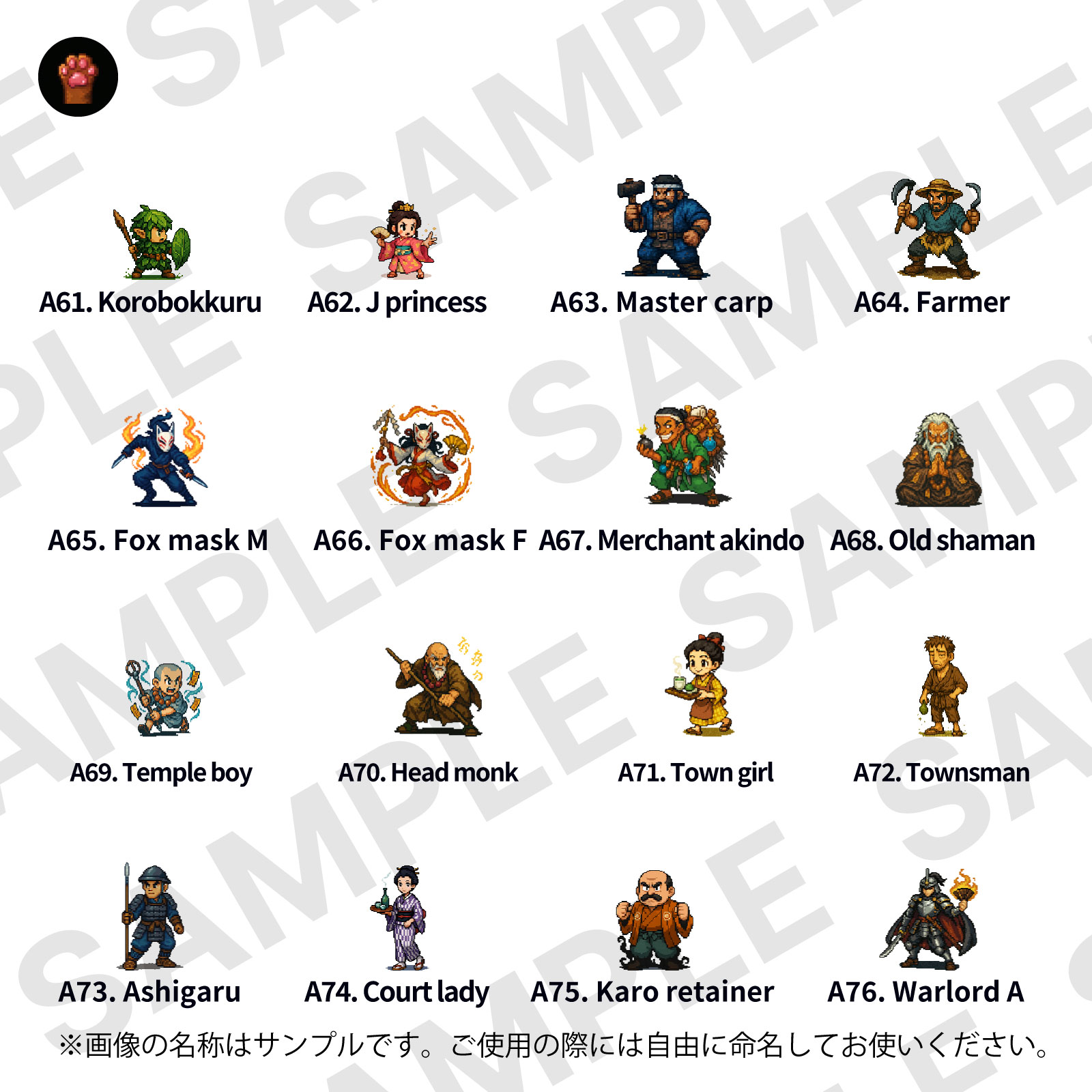 A set of 30 SNES-style pixel sprites depicting Japanese people from the Yayoi through Edo periods—samurai and ashigaru, shrine monks and temple boys, merchants, town girls, court ladies, plus a few myth-flavored figures like yokai warlords and giant spirits. Perfect for quickly populating castles, temples, villages, and battle scenes with a distinct “Japanese” flavor.