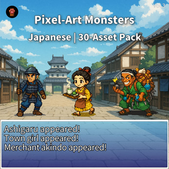 | Tags | character-sprites, game-assets, Horror, japanese, japanese-fantasy, japanese-history, npc-characters, Pixel Art, samurai, Sprites |